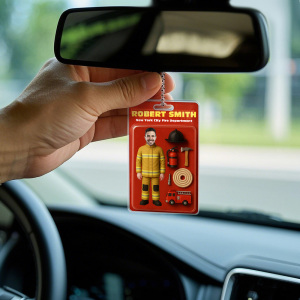 カスタム2d効果アクションフィギュアカスタマイズ可能なヘッドパッケージおもちゃ箱スタイルのアートギフトパーソナライズされたアクリルカーハンガー消防士へのギフト