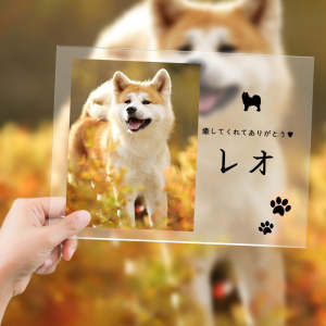 カスタムフォトアクリル製写真立て‐愛犬の写真と名前とメッセージ入れ可能なメモリーを込めった卓上ペットグッズプラーク-肉球柄横向き