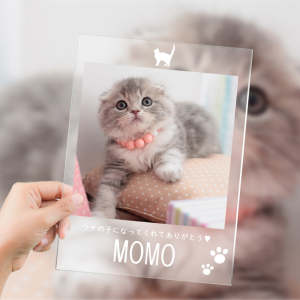 カスタムフォトアクリル製写真立て‐ネコの写真と名前とメッセージ入れ可能なメモリーを込めった卓上ペットグッズプラーク-肉球柄縦向き