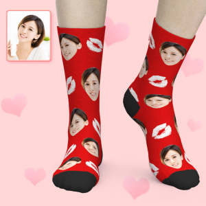 カスタムフェイスソックス-写真入れ可能な赤い唇とハート柄の面しろ靴下バレンタインデーギフト