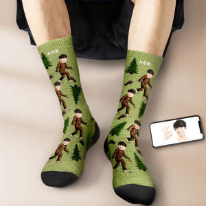 カスタムフェイスソックス-写真入り名入れ可能な猿人と松の木柄のオリジナル靴下プレゼント