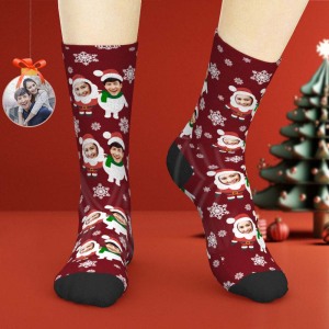 カスタムフェイスソックス-2つの顔の写真入れ可能な雪柄のオリジナル靴下プレゼント-可愛いサンタと雪だるま