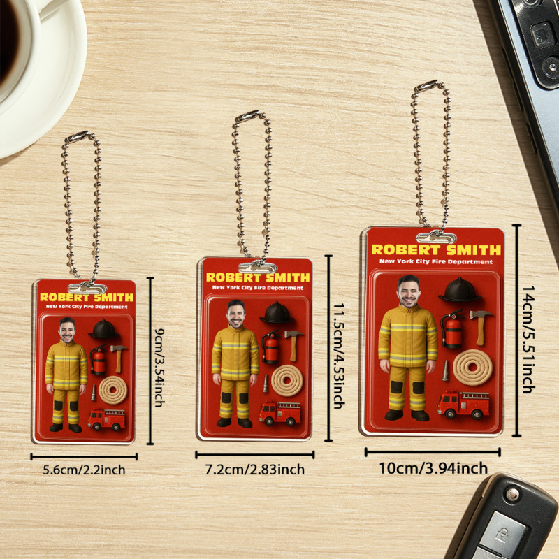 カスタム2d効果アクションフィギュアカスタマイズ可能なヘッドパッケージおもちゃ箱スタイルのアートギフトパーソナライズされたアクリルカーハンガー消防士へのギフト