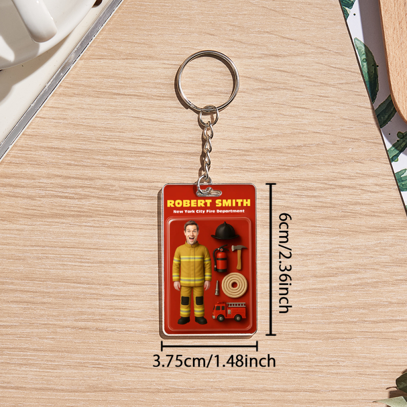 カスタム2d効果アクションフィギュアカスタマイズ可能なヘッドパッケージおもちゃ箱スタイルのアートギフトパーソナライズされたアクリルキーチェーン消防士へのギフト