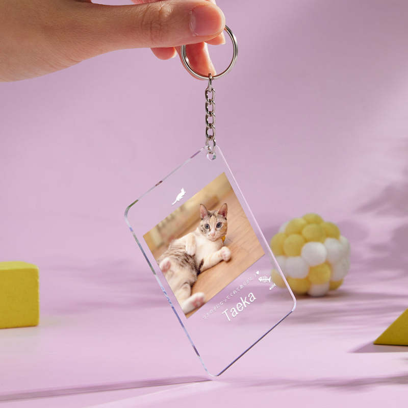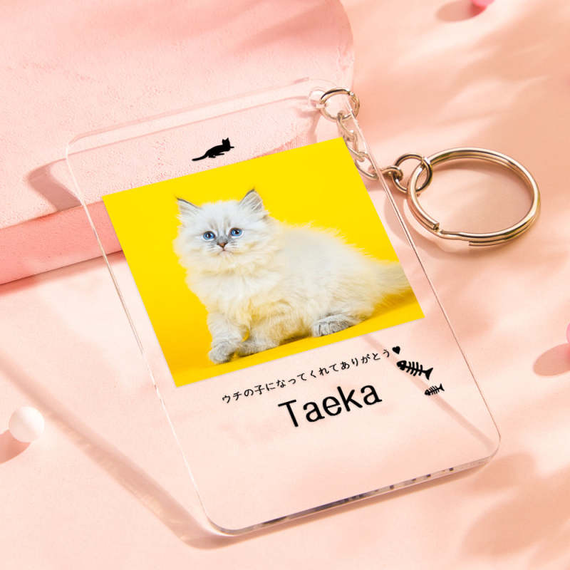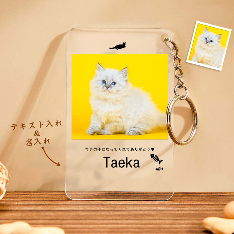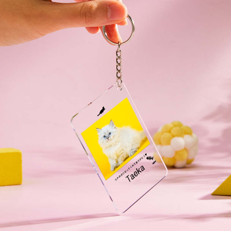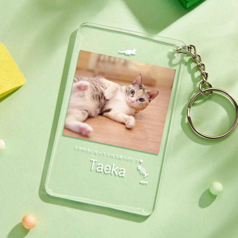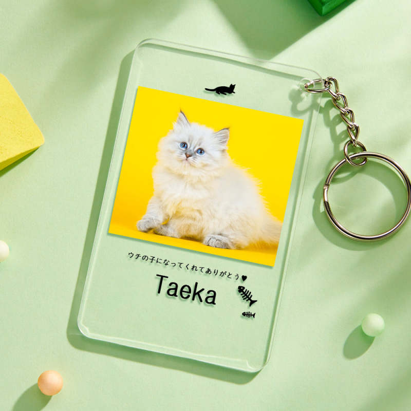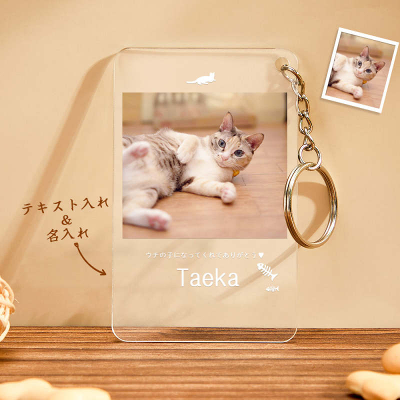 カスタムフォトアクリル製キーホルダー‐ネコの写真と名前とメッセージ入れ可能なメモリーを込めったキーホルダー-魚の骨柄