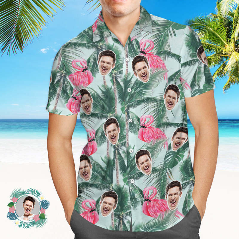 カスタムフェイスアロハシャツ - 写真入れ可能な男性用フラミンゴ柄緑のアロハシャツギフト