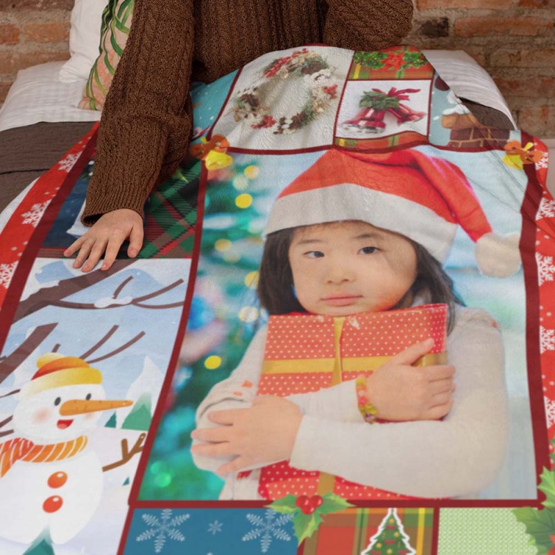 カスタムフォトブランケット-写真入れ可能なサクリスマスの雪だるま柄のフリース毛布子供へのクリスマスひざかけギフト