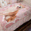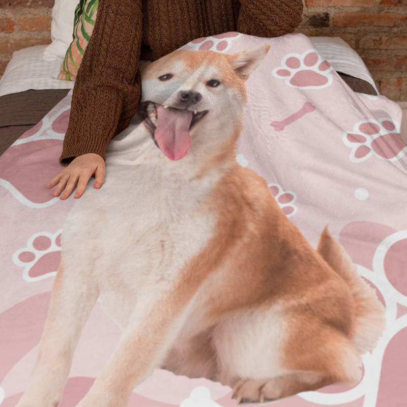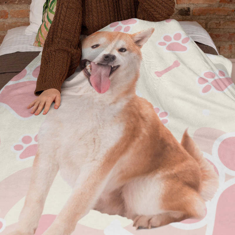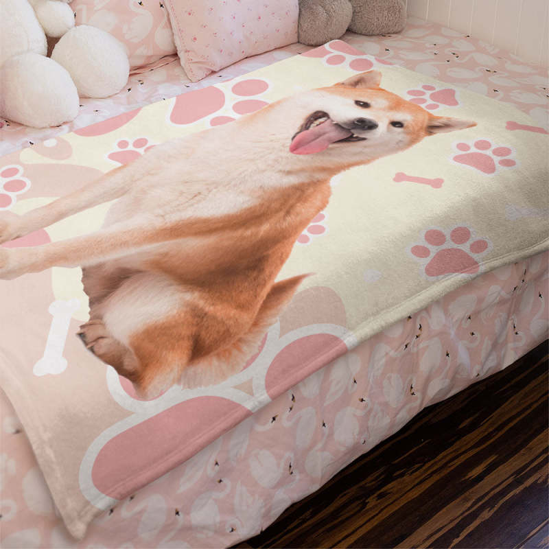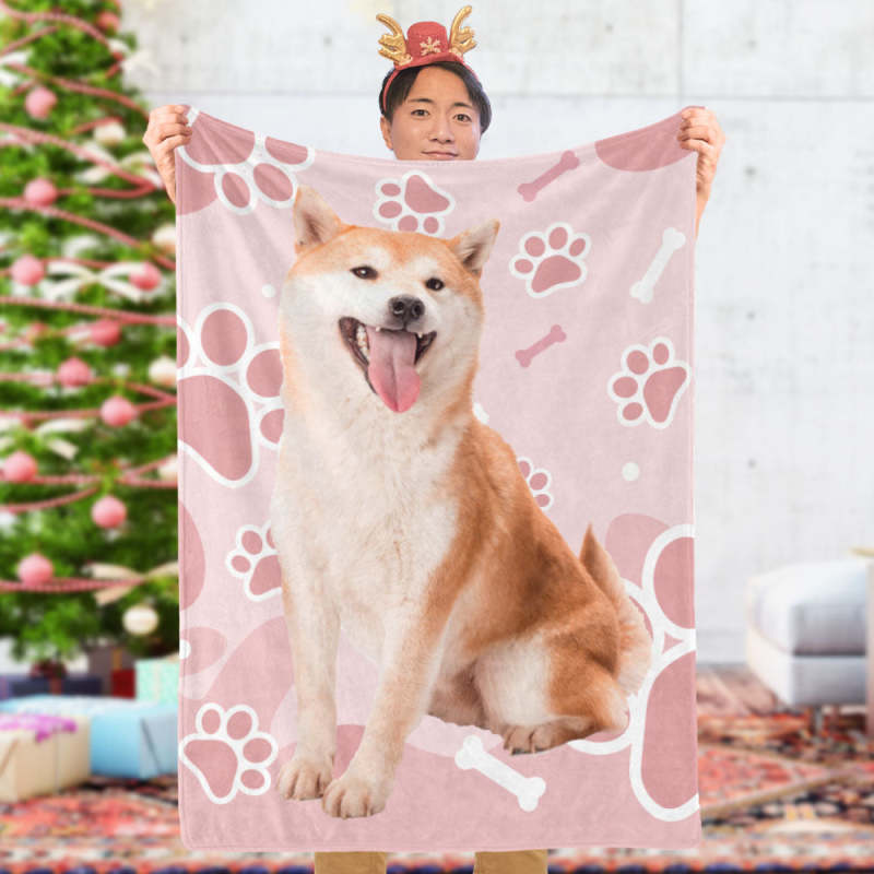 カスタムフォトブランケット-可愛いペット写真入れ可能な犬の肉球と骨柄のフリース毛布子供へのクリスマスひざかけギフト