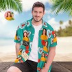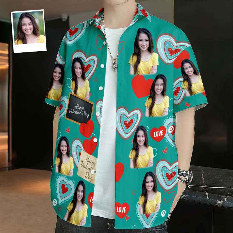 カスタムフォトアロハシャツ-お好きな写真入り可能なオリジナルバレンタインアロハシャツ - 甘いハート柄グリーン