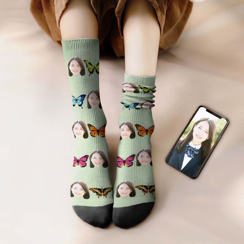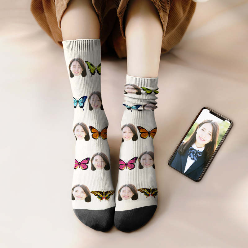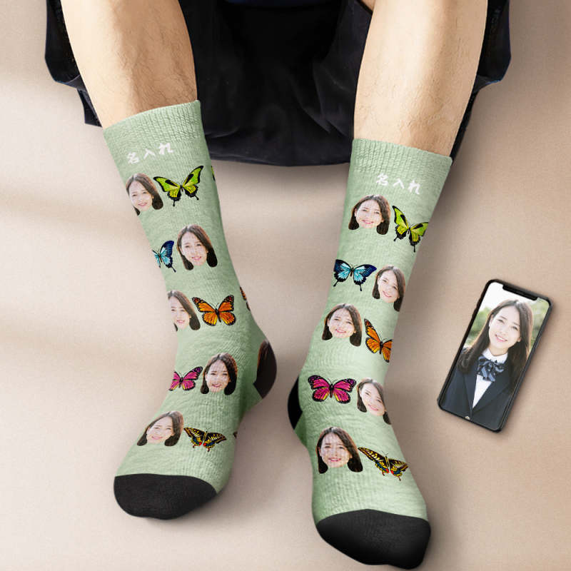 カスタムフェイスソックス-写真入れ名入れ可能な綺麗な蝶柄のオリジナル靴下プレゼント