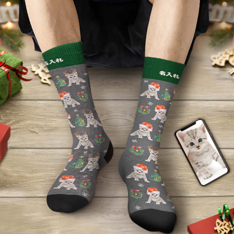 カスタムフェイスソックス-写真入れ名入れ可能なオリジナルクリスマス靴下プレゼント-サンタ帽子をかぶったかわいいネコ