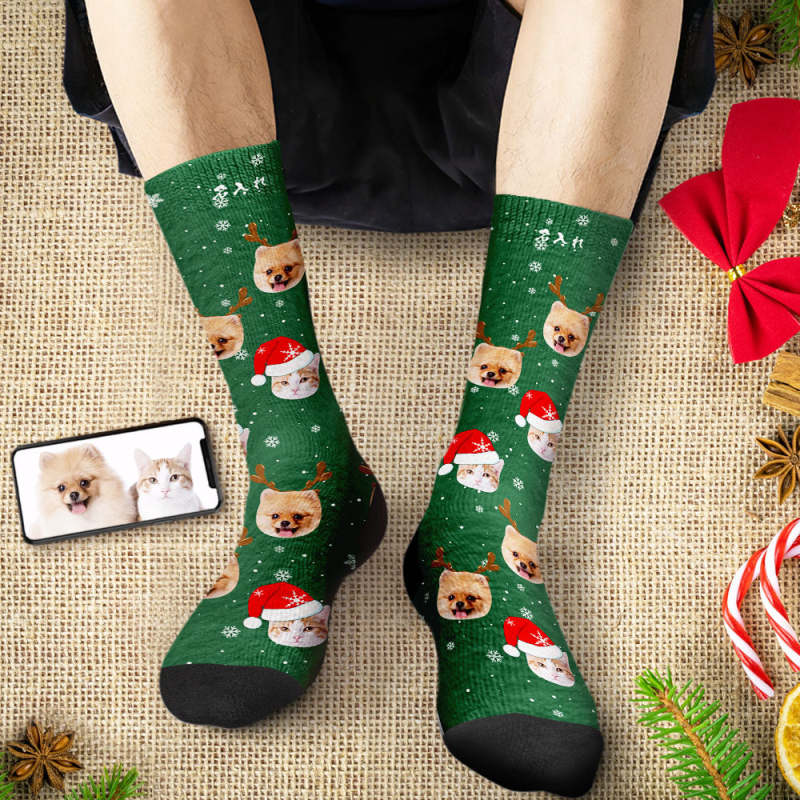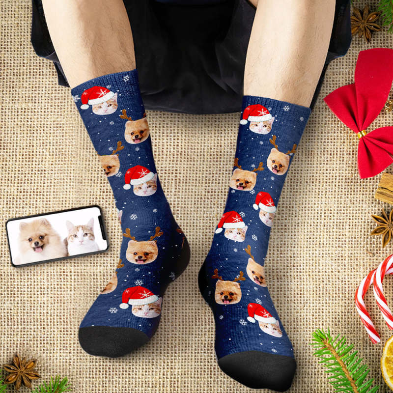 カスタムフェイスソックス-ペット写真入れ名入れ可能なサンタ帽子と鹿の角柄のオリジナルクリスマス靴下プレゼント