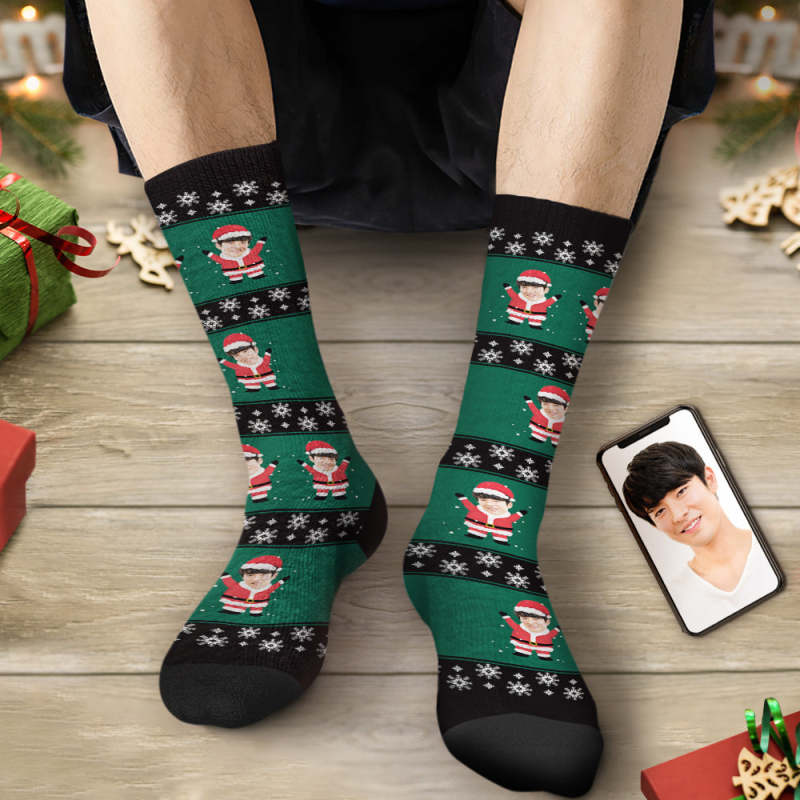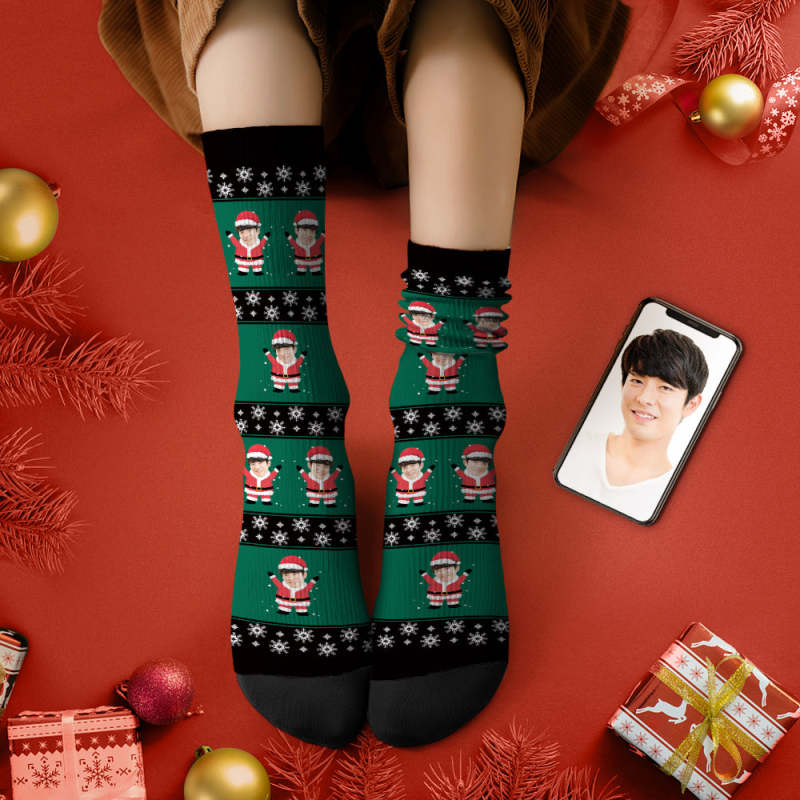 カスタムフェイスソックス-写真入れ名入れ可能なオリジナルクリスマス靴下プレゼント-雪花とサンタクロース柄