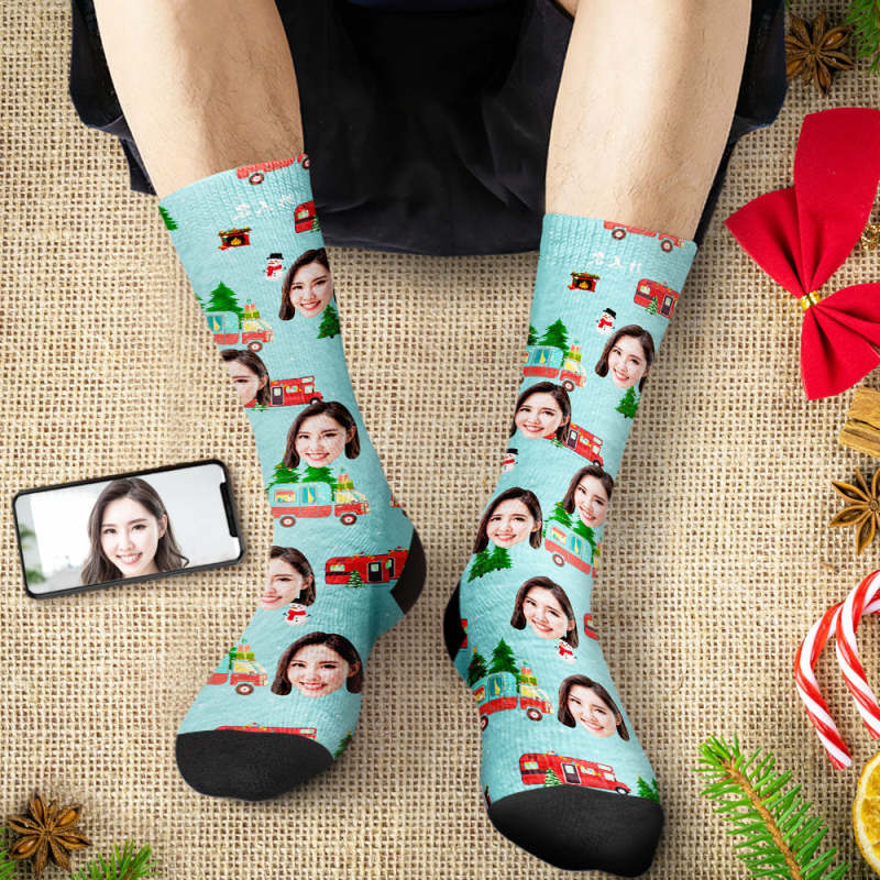 カスタムフェイスソックス-ペット写真入れ名入れ可能なクリスマスツリーと車柄のオリジナルクリスマス靴下プレゼント