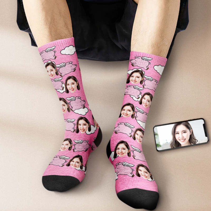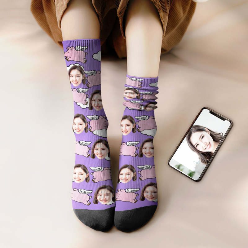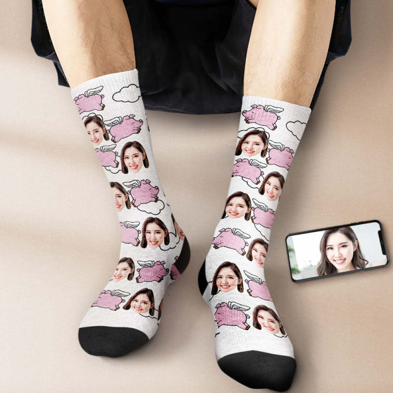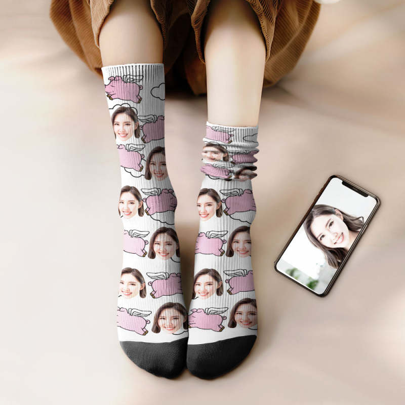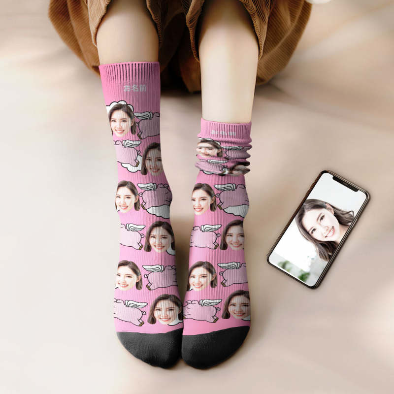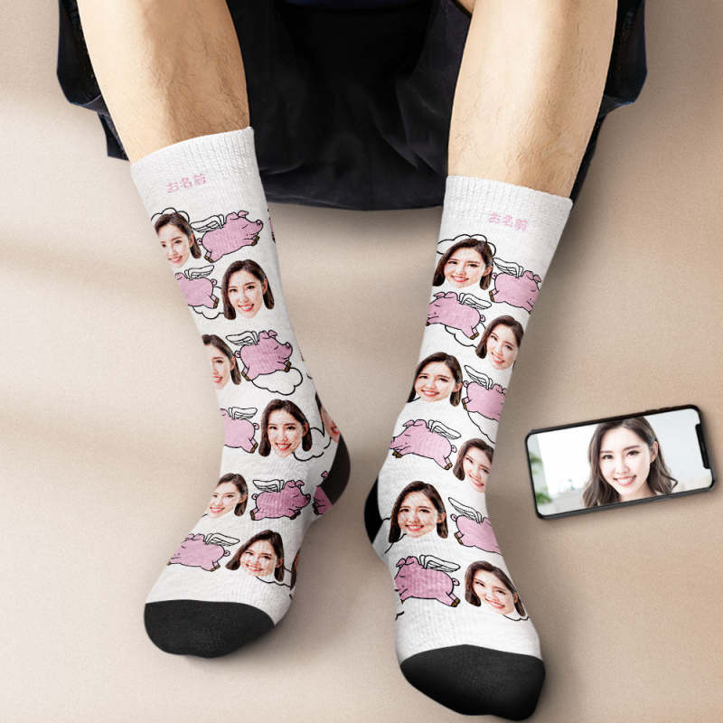 カスタムフェイスソックス-写真入り名入れ可能な豚と雲柄のオリジナル靴下プレゼント