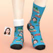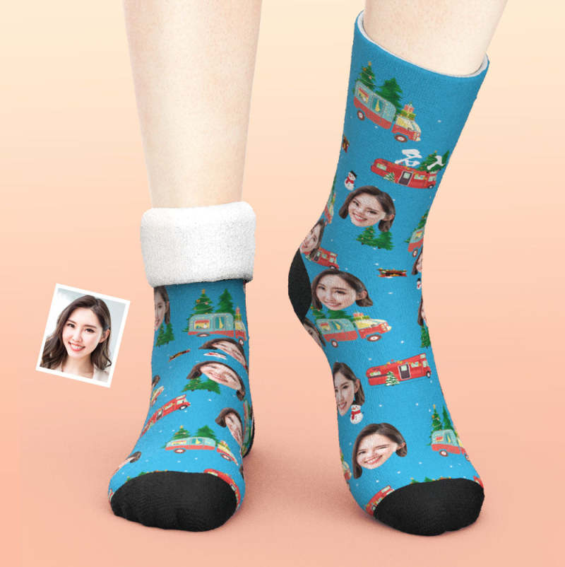 カスタム厚手フェイスソックス-ペット写真入れ名入れ可能なクリスマスツリーと車柄のオリジナル秋冬用暖かいクリスマス靴下プレゼント